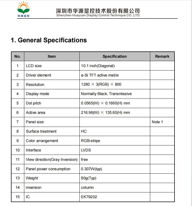 By reviewing the basic parameter table, dimensional drawings, and optical characteristics table in an LCD screen specification sheet, users can initially select the required screen model. After finalizing the selection, a more detailed review of the specification sheet is recommended, as it contains many additional important parameters and information worth exploring—every page is valuable. This detailed review is typically a key consideration for technical personnel during the later design and integration phases. However, the content covered above is sufficient to help you successfully understand an LCD screen specification sheet and select the right LCD display product for your needs.Name of Company: Shenzhen Huayuan Display Control Technique Co.,LTD
