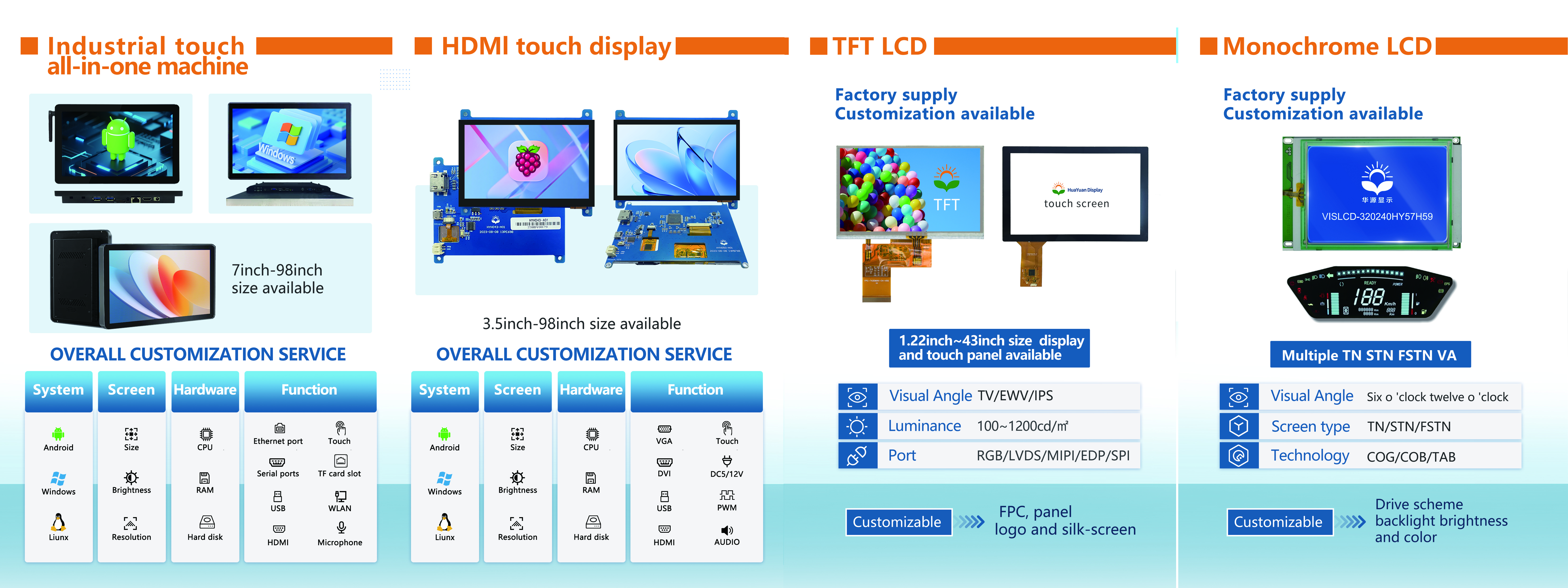 15 years of experience in manufacturing LCD displays,HDMI touch diplay, industrial touch all-in-one machine, supporting customized solutions.